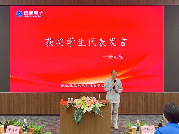 “進(jìn)芯電子獎(jiǎng)學(xué)金”獲獎(jiǎng)學(xué)生代表發(fā)言,他感謝進(jìn)芯電子對(duì)青年學(xué)子的支持,感謝學(xué)校對(duì)自身的培養(yǎng),表示深耕專(zhuān)業(yè)知識(shí)、厚植家國(guó)情懷是成才的必經(jīng)之路,他將再接再厲,勇創(chuàng)佳績(jī)。
