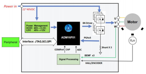 ADM16x是一款高度集成的高性能BLDC/PMSM控制器,內(nèi)部集成了6路 NMOSPre-Driver,運算放大器,PGA,比較器,高速 ADC,SCI,SPI 等模塊。同時,它采用高性能16位CPU,內(nèi)嵌 32Kx16 位 Flash, 512x16位ROM,最高工作頻率為40MHZ,可滿足高性能無刷電機控制的應用要求,并簡化系統(tǒng)成本。