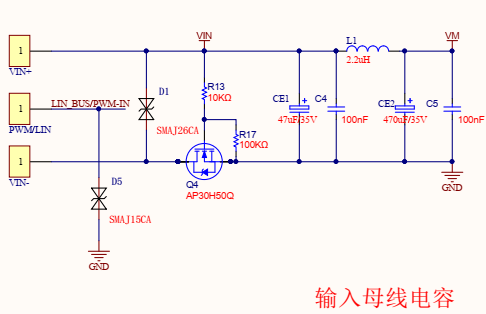 輸入通過(guò)N管,實(shí)現(xiàn)防反功能。使用CE1、L1和CE2,構(gòu)成π型濾波。能有效減少電源的干擾。