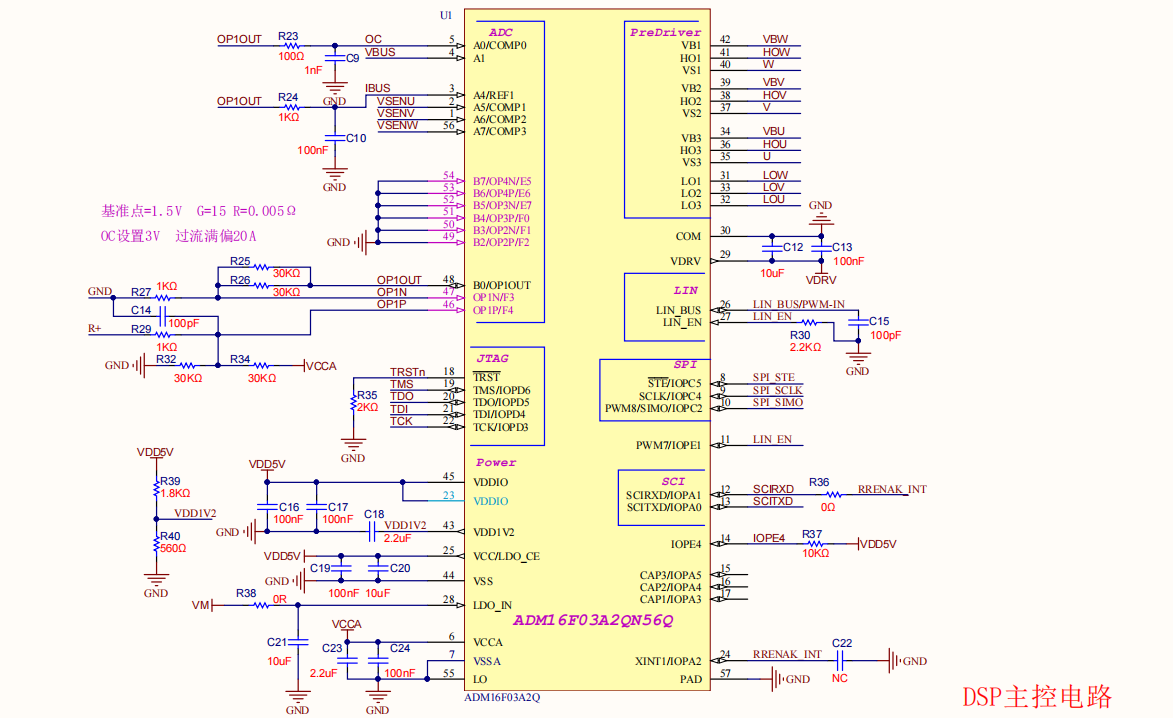 單采樣電阻0.005R,通過(guò)差分走線(xiàn)至ADM16F03A2的OP1的獨(dú)立運(yùn)放電路進(jìn)行運(yùn)放輸入到芯片口采樣進(jìn)行運(yùn)算。