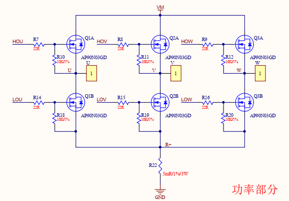 功率橋電路采用上下管均為NMOS的配置,總計(jì)6個(gè)NMOS組成三相H半橋驅(qū)動(dòng)電路。