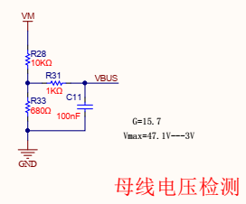 ADC采樣母線(xiàn)采樣電路,母線(xiàn)電壓的值進(jìn)行分壓送到芯片AD口,參與到FOC的運(yùn)算。