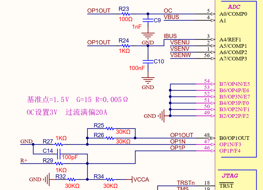通過(guò)內(nèi)部獨(dú)立運(yùn)放OP1組進(jìn)行差分運(yùn)放15倍,送到A0口用做過(guò)流保護(hù),送到A4口進(jìn)行恒功率控制。