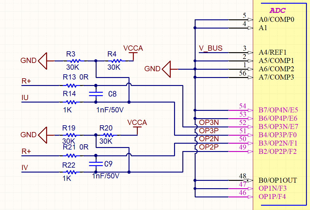 ADC采樣電路包括兩路橋臂相電流的采樣和母線電壓采樣。相線電流用于堵轉(zhuǎn)位置檢測 后續(xù)還可用于電流環(huán) 母線電壓檢測除用于保護(hù)外 還為軟件算法的計(jì)算提供電壓參數(shù)
