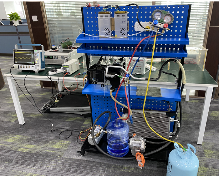 進(jìn)芯電子實驗室具備汽車空調(diào)壓縮機(jī)帶負(fù)載測試條件,可以實現(xiàn)自由更換壓縮機(jī)、背壓、平衡壓等測試條件,下圖是進(jìn)芯電子壓縮機(jī)測試平臺。