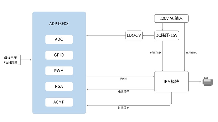 ADP16F03搭載16位定點(diǎn)DSP內(nèi)核(主頻150MHz,哈佛總線結(jié)構(gòu)),集成運(yùn)算加速單元(支持除法、開(kāi)方和帕克變換等指令),高效運(yùn)行單電阻無(wú)感FOC算法,實(shí)現(xiàn)微秒級(jí)電機(jī)控制關(guān)鍵運(yùn)算,為壓縮機(jī)與外風(fēng)機(jī)協(xié)同調(diào)節(jié)提供強(qiáng)力算力保障。